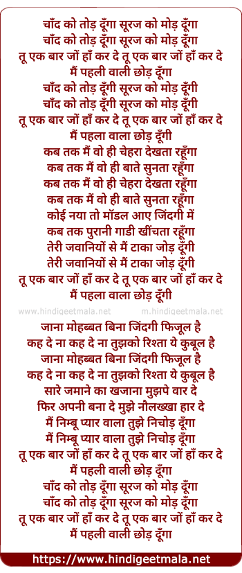 Lyrics of Chand Ko Tod Dhunga Suraj Ko Modd Dunga - चाँद को तोड़ दूँगा सूरज को मोड़ दूँगा