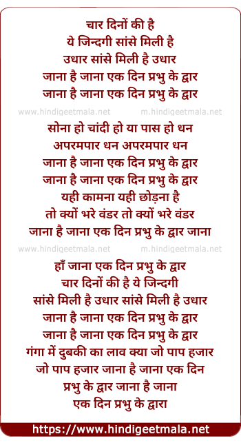 Lyrics of Char Dino Ki Hai Ye Zindagi - चार दिनों की ये जिन्दगी