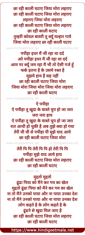 Lyrics of Chha Rahi Kali Ghata Jiyara Mora - छा रही काली घटा जिया मोरा