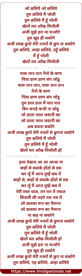 Lyrics of Chhaliye Tum Chhaliye - छलिये तुम छलिये