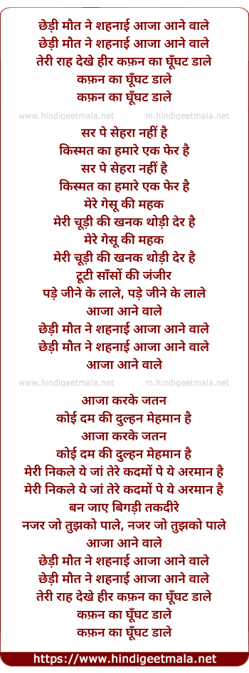 Lyrics of Chhedi Maut Ne Shahnayi Aaja Aane Wale - छेड़ी मौत ने शहनाई आजा आने वाले