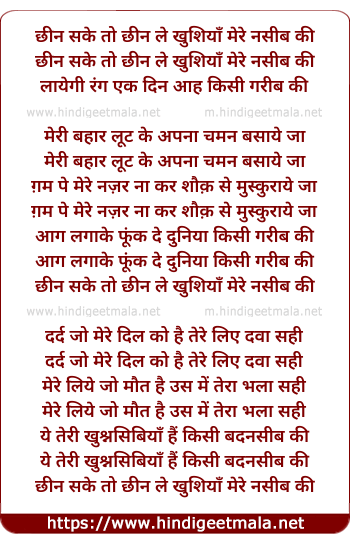 Lyrics of Chhin Sake To Chhin Le Khushiyaan Mere Nasib Ki - छीन सके तो छीन ले खुशियाँ मेरे नसीब की