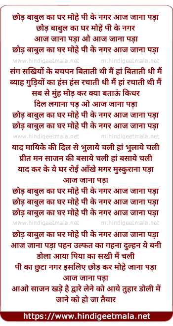 Lyrics of Chhod Babul Ka Ghar - छोड़ बाबुल का घर