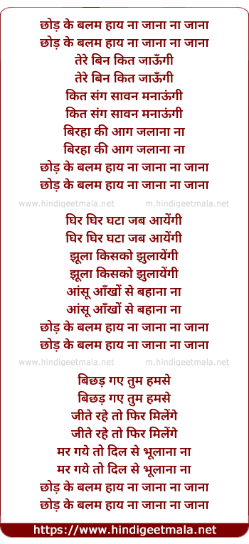 Lyrics of Chhod Ke Baalam Haye - छोड़ के बलम हाय ना जाना ना जाना
