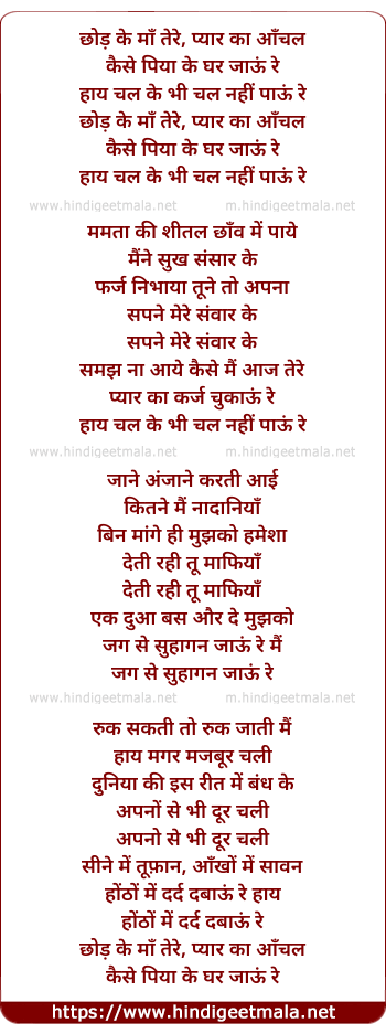 Lyrics of Chhod Ke Maa Tere Pyar Ka Aanchal - छोड़ के माँ तेरे, प्यार का आँचल