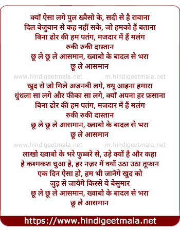 Lyrics of Chhu Le Aasman (Remix) - क्यों ऐसा लगे पुल ख्वैसो के, सदी से है रावाना