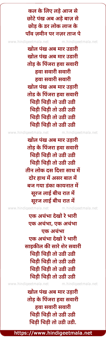 Lyrics of Chidi To Udi Udi - चिडी तो उडी उडी