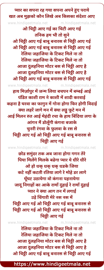 Lyrics of Chithi Aaye Gayi Babu Banaras Se - चिठ्ठी आये गयी बाबू बनारस से