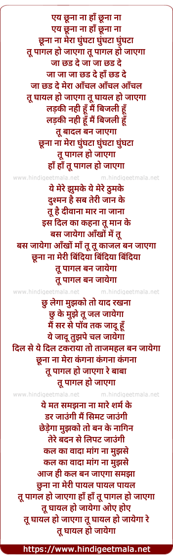Lyrics of Choona Na Mera Ghungta - छूना ना मेरा घुंघटा