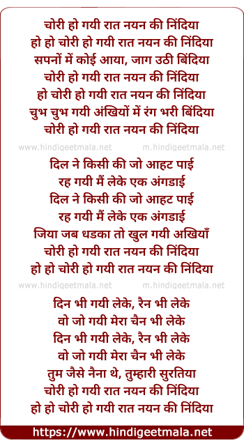 Lyrics of Chori Ho Gayi Raat Nayan Ki Nindiya - चोरी हो गयी रात नयन की निंदिया
