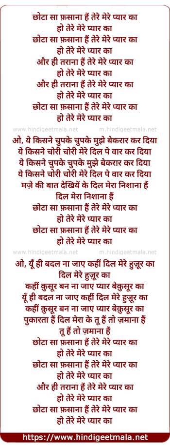 Lyrics of Chota Sa Fasana Hai Tere Mere Pyar Ka - छोटा सा फ़साना हैं तेरे मेरे प्यार का