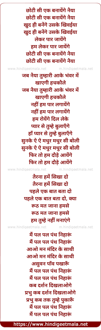 Lyrics of Choti Si Ek Banayenge Naiya - छोटी सी एक बनायेंगे नैया