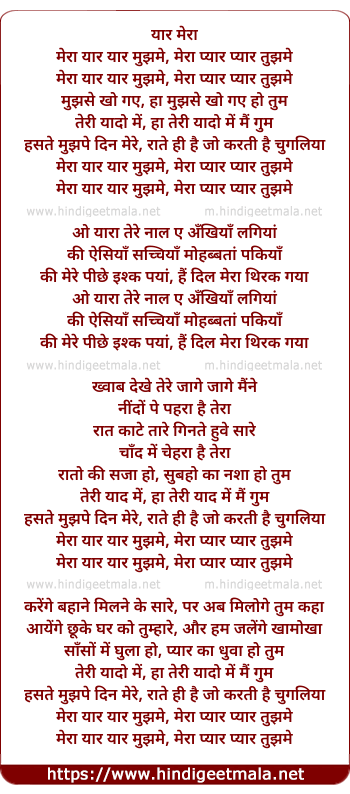 Lyrics of Chugliyaan (Mera Yaar Yaar Mujh Me, Mera Pyar Pyar Tujh Me) - यार मेरा