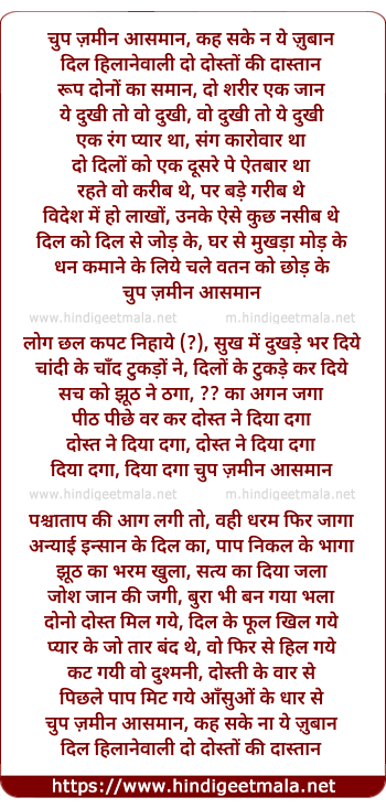 Lyrics of Chup Zamin Aasamaan, Kah Sake Na Ye Zubaan - चुप ज़मीन आसमान, कह सके न ये ज़ुबान