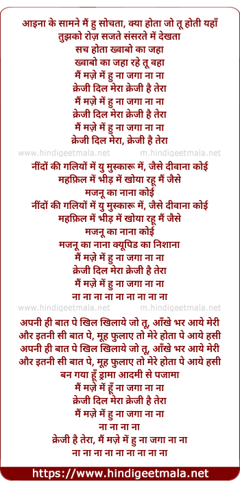 Lyrics of Crazy Dil (Sonu Nigam) - आइना के सामने मैं हु सोचता, क्या होता जो तू होती यहाँ