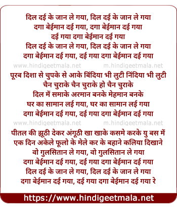 Lyrics of Dil Dayi Ke Jaan Le Gaya, Daga Beiman Dai Gaya - दिल दई के जान ले गया, दगा बेईमान देई गया