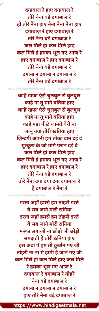 Lyrics of Dagabaaz Re, Tore Naina Bade Dagabaaz Re - दगाबाज़ रे हाय दगाबाज़ रे तोरे नैना बड़े दगाबाज़ रे