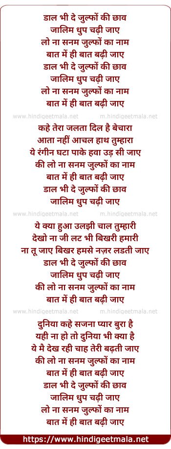 Lyrics of Dal Bhi Do Palkon Ki Chhaon Zalima Dhup Chadi Jaye - डाल भी दे जुल्फों की छाव जालिमा धूप चढ़ी जाये