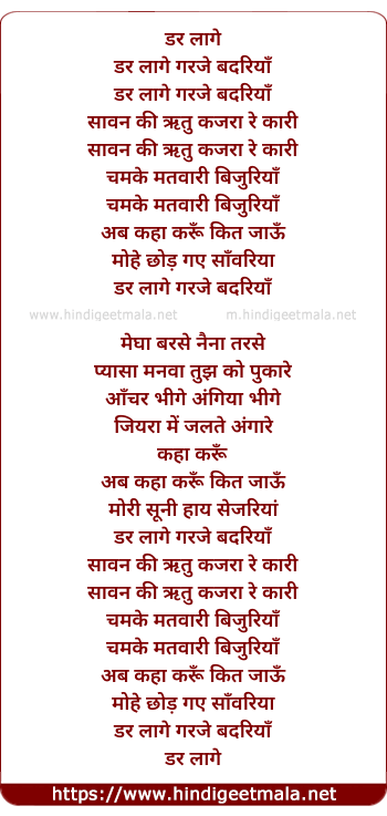 Lyrics of Dar Laage Garaje Badariyaa, Saavan Ki Ritu Kajaraa Re Kaari - डर लागे गरजे बदरियाँ, सावन की ऋतु कजरा रे कारी