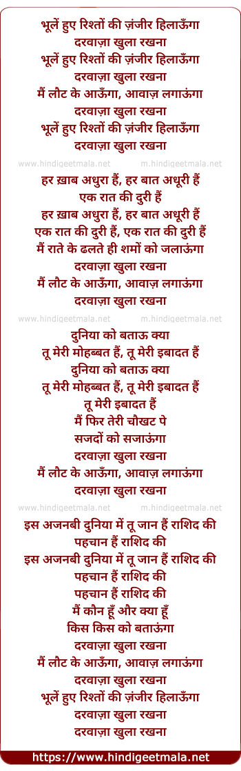 Lyrics of Darwaza Khulaa Rakhna - भूलें हुए रिश्तों की ज़ंजीर हिलाऊँगा