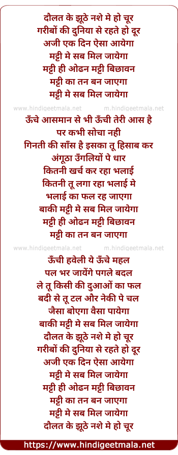 Lyrics of Daulat Ke Jhuthe Nashe Me Ho Choor - दौलत के झूठे नशे मे हो चूर