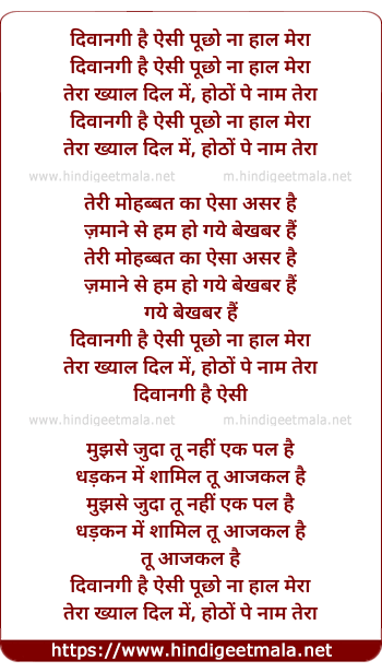 Lyrics of Deewaanagi Hai Aisi - दिवानगी है ऐसी पूछो ना हाल मेरा