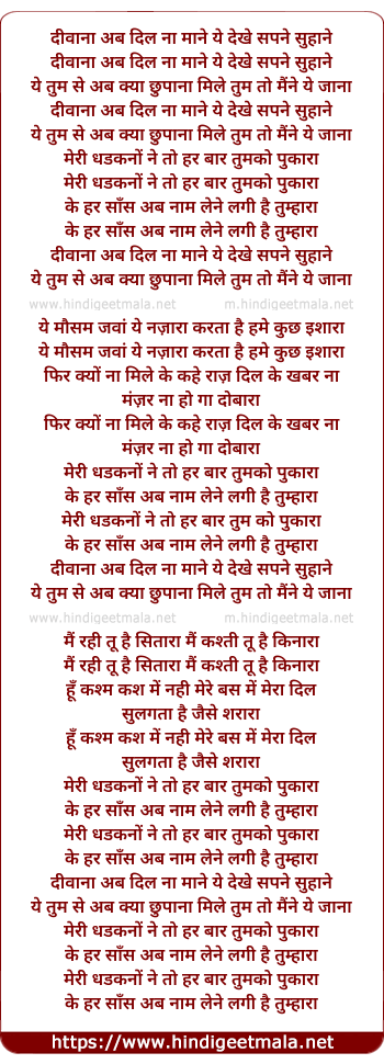 Lyrics of Deewana Ab Dil Na Mane - दीवाना अब दिल ना माने