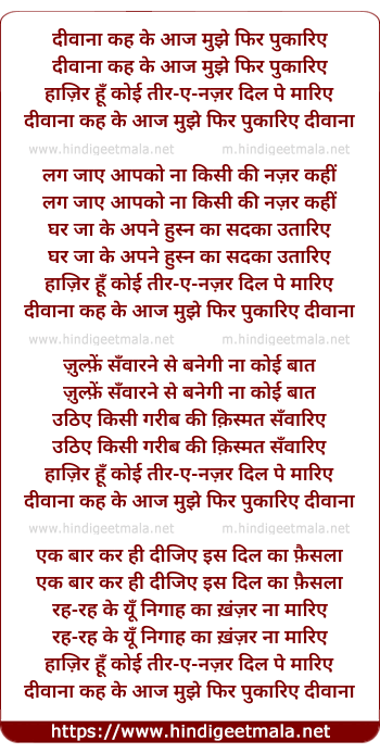 Lyrics of Deewana Keh Ke Aaj Mujhe Phir Pukariye - दीवाना कह के आज मुझे फिर पुकारिए