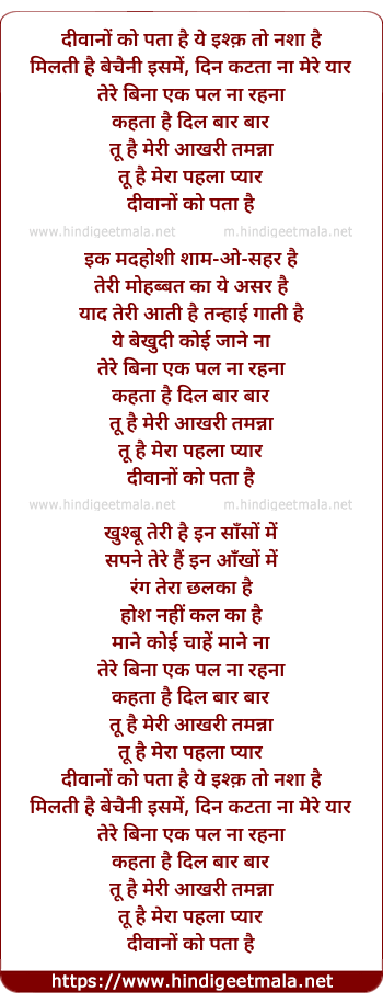 Lyrics of Diwano Ko Pata Hai Ye Ishk To Nasha Hai - दीवानों को पता है ये इश्क़ तो नशा है