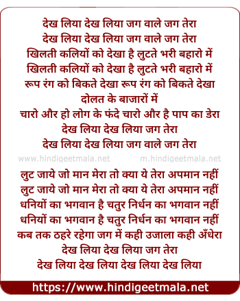 Lyrics of Dekh Liya Jag Wale Jag Tera - देख लिया जग वाले जग तेरा