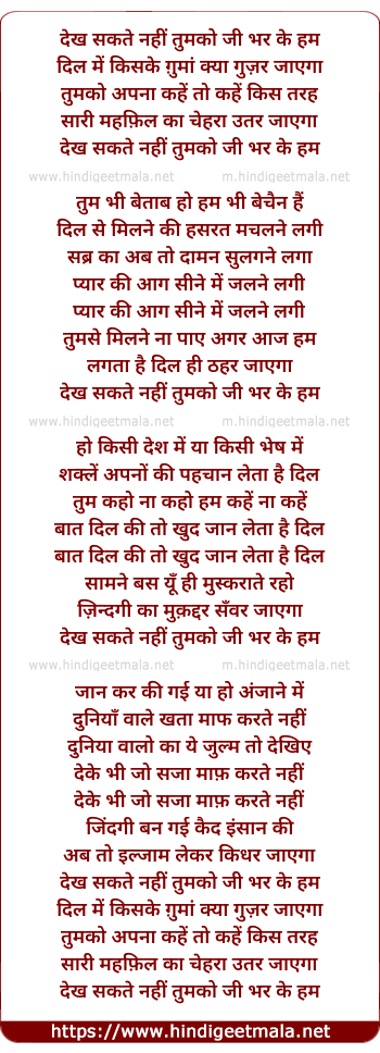 Lyrics of Dekh Sakte Nahi Tumko Ji Bhar Ke Ham - देख सकते नहीं तुमको जी भर के हम