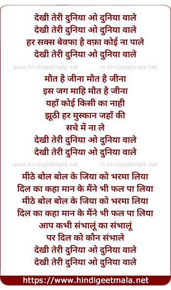 Lyrics of Dekhi Teri Duniya O Duniya Wale - देखी तेरी दुनिया ओ दुनिया वाले
