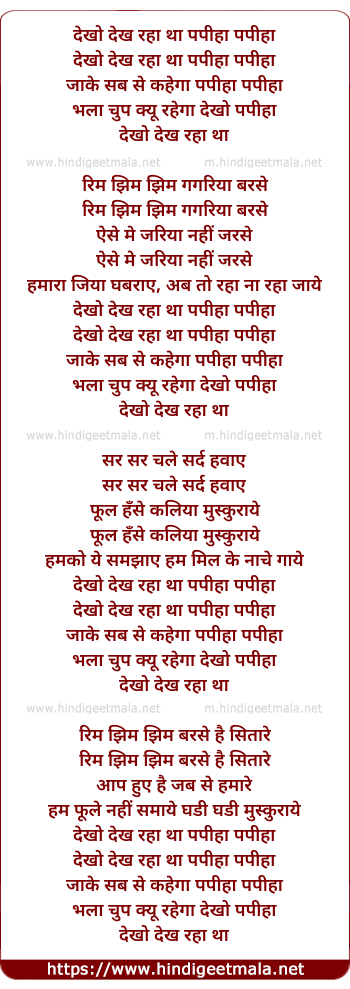 Lyrics of Dekho Dekh Raha Tha Papiha, Papiha Jake Sab Se Kahega - देखो देख रहा था पपीहा पपीहा
