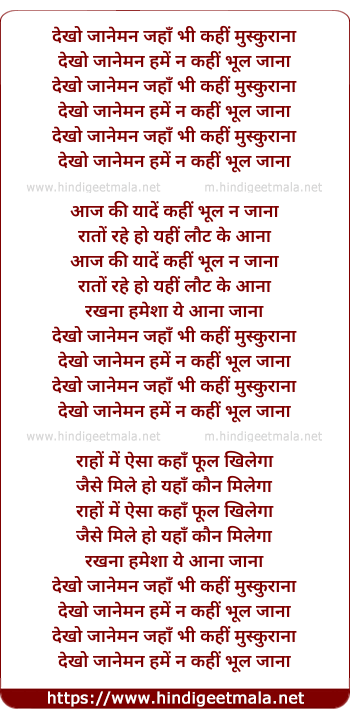 Lyrics of Dekho Janeman Jahan Bhee Kahee Muskurana - देखो जानेमन जहाँ भी कहीं मुस्कुराना