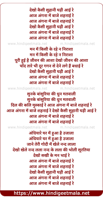 Lyrics of Dekho Kaisi Suhani Ghadi Aayi Re Aaj Angna Me Baje - देखो कैसी सुहानी घड़ी आई रे आज अंगना में बजे