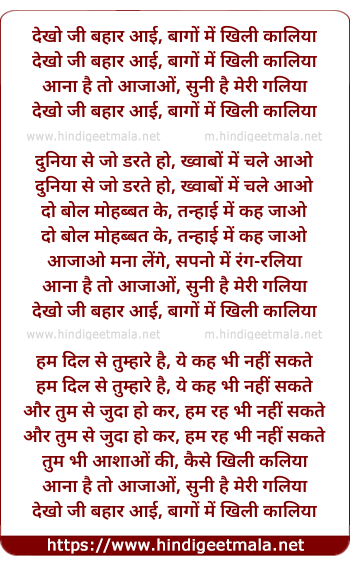 Lyrics of Dekhoji Bahar Aayi, Baagon Men Khili Kaliyaan - देखोजी बहार आई, बागो में खिली कालिया