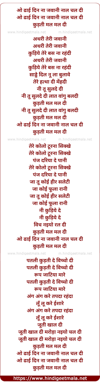 Lyrics of Dhaai Din Na Javaani Naal Chaladi - ओ ढाई दिन ना जवानी नाल चल दी