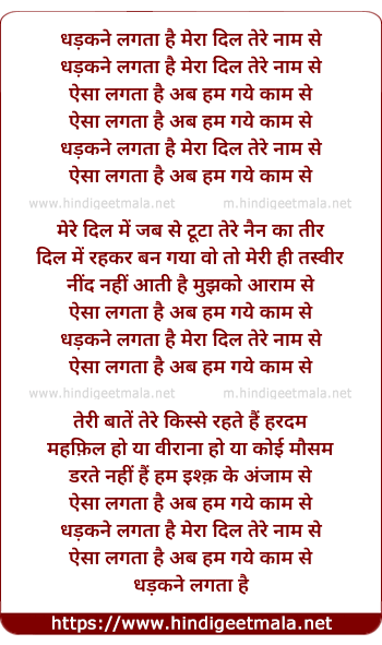 Lyrics of Dhadakane Lagata Hai Mera Dil Tere Naam Se - धड़कने लगता है मेरा दिल तेरे नाम से