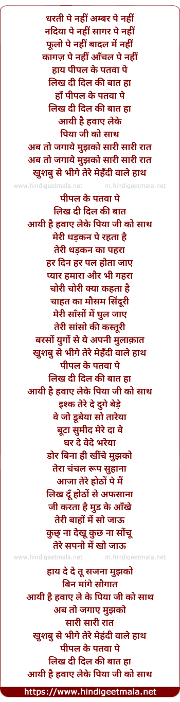 Lyrics of Dharati Pe Nahin Pipal Ke Patavaa Pe - धरती पे नहीं हाय पीपल के पतवा पे