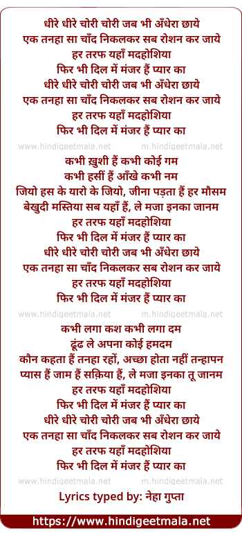 Lyrics of Dhire Dhire Choree Choree Jab Bhee Andhera Chhaye - धीरे धीरे चोरी चोरी जब भी अँधेरा छाये