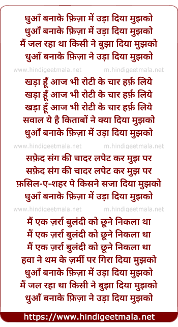 Lyrics of Dhuaan Banaa Ke Fizaa Ne Udaa Diyaa Mujhako - धुआँ बनाके फ़िज़ा में उड़ा दिया मुझको