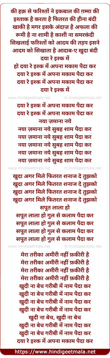 Lyrics of Dhyahar E Ishq Mein - की हक़ से फरिश्तों ने इकबाल की ग़म्मा की