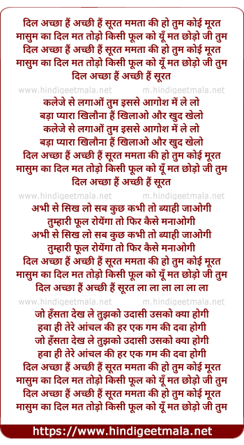 Lyrics of Dil Achchha Hai Achchi Hai Surat - दिल अच्छा हैं अच्छी हैं सूरत
