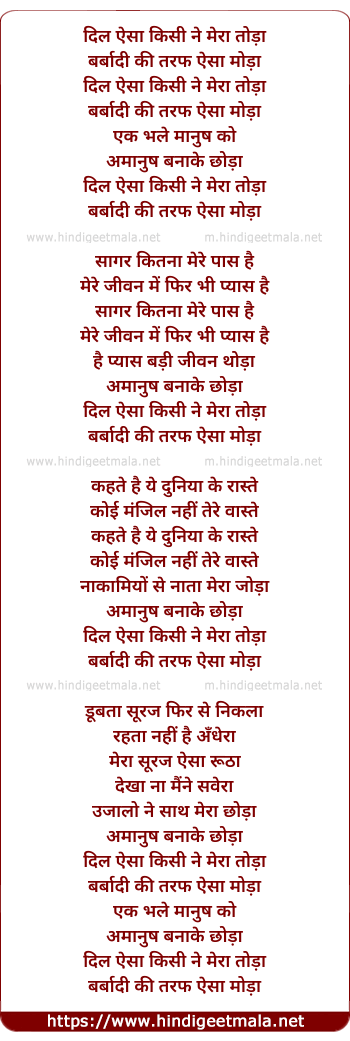 Lyrics of Song : Dil Aisa Kisine Mera Toda (dil aisaa kisine meraa todaa