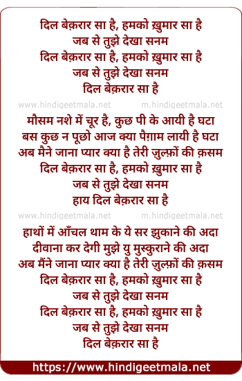 Lyrics of Dil Bekarar Sa Hai, Humko Khumar Sa Hai (By Rafi) - दिल बेक़रार सा है हमको ख़ुमार सा है
