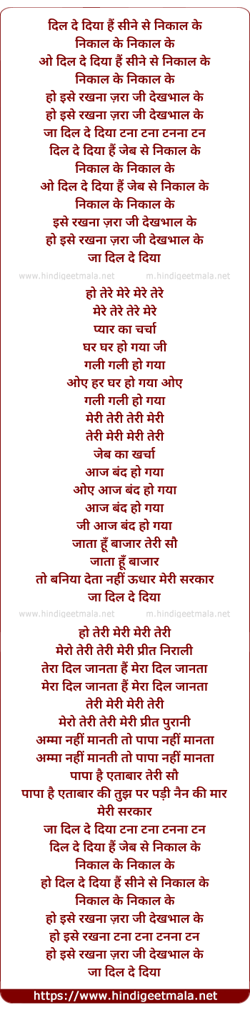 Lyrics of Dil De Diya Hai Sine Se Nikal Ke - दिल दे दिया हैं सीने से निकाल के