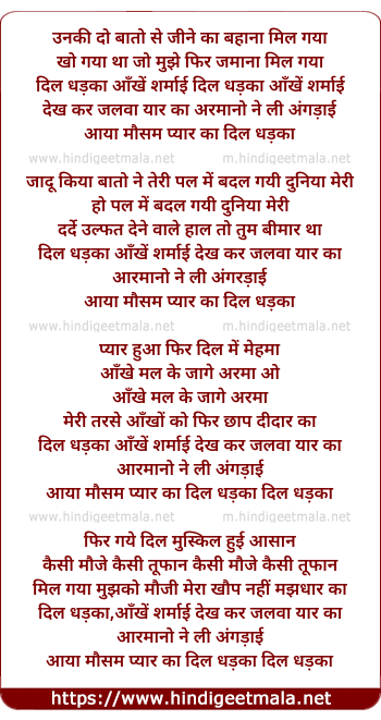 Lyrics of Dil Dhadka Aankhen Sharmayin - दिल धड़का आँखें शर्माई