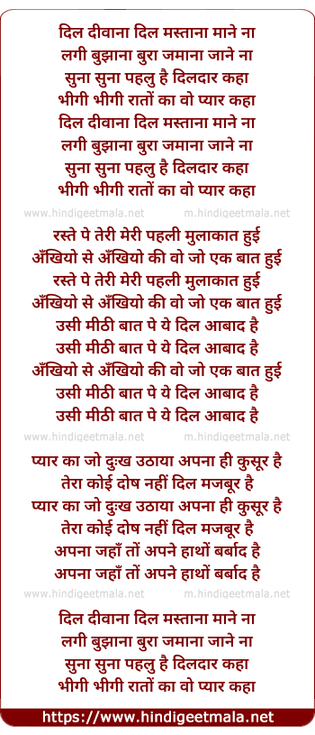 Lyrics of Dil Diwana Dil Mastana Mane Na - दिल दीवाना दिल मस्ताना माने ना