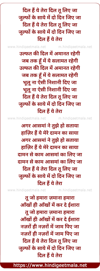 Lyrics of Dil Hai Ye Tera Dil Tu Liye Ja - दिल हैं ये तेरा दिल तू लिए जा