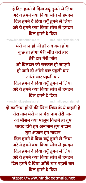 Lyrics of Dil Humne De Diya Kyu Tumne Le Liya - दिल हमने दे दिया क्यूँ तुमने ले लिया
